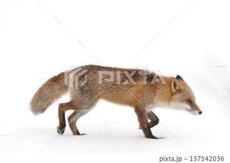 凍結した湖上を歩く冬毛のキタキツネ キツネ 狐 北海道自然 もふもふ