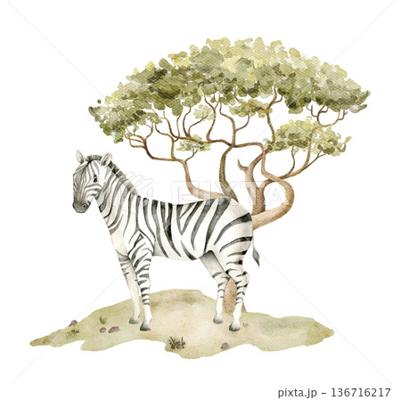 Watercolor zebra standing near acacia tree on sandy savanna ground. Safari wildlife element for nursery mural, jungle wallpaper, textile print, classroom decor and Africa themed design projects.