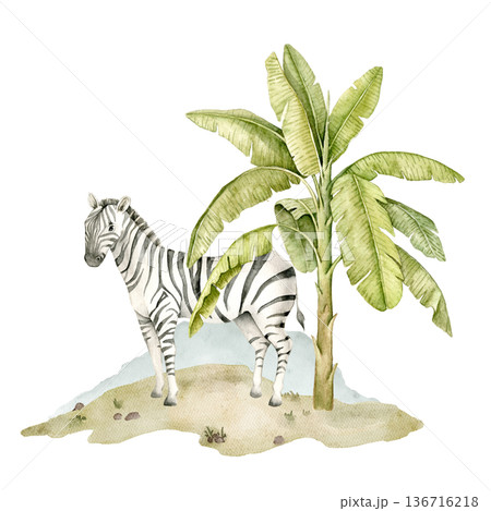 Watercolor zebra standing near banana palm on sandy savanna ground. African safari wildlife illustration for nursery wallpaper, textile print, mural decor and jungle themed classroom projects.
