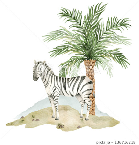 Watercolor zebra standing near date palm on sandy savanna ground. African safari wildlife element for nursery wallpaper, textile print, mural decor and jungle themed interior design.