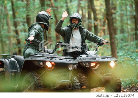 Giving high fives by the hands. Two male atv riders is in the forest together
