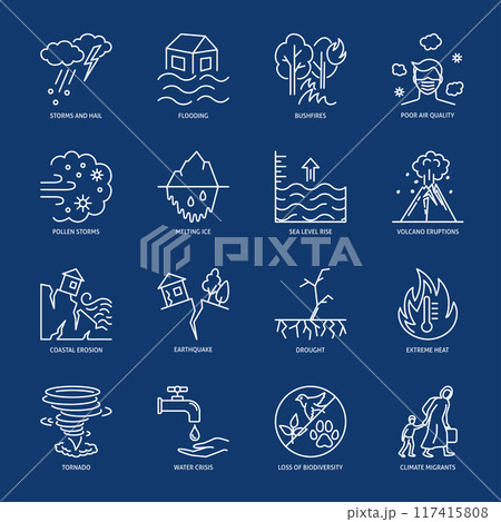 Climate change consequences line icon set