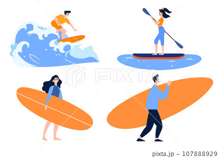 Hand Drawn Tourist teen characters are playing surfboards at the sea in flat style