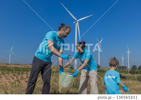 Family collecting garbage at park