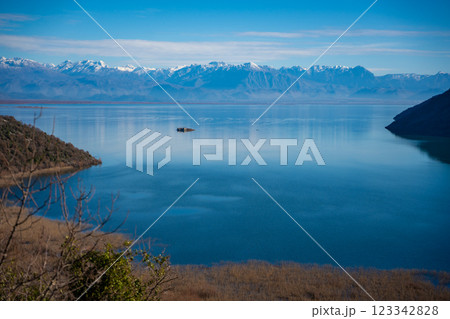 View of Skadar Lake with.reeds on mountains background in winter, Montenegro