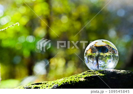 明るい草むらの左に綺麗な地球儀の水晶 エコロジーイメージ ノーマルカラー