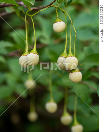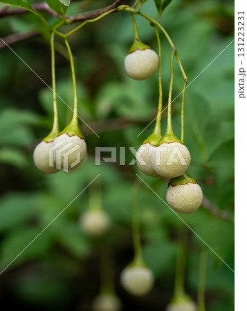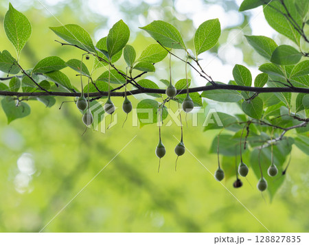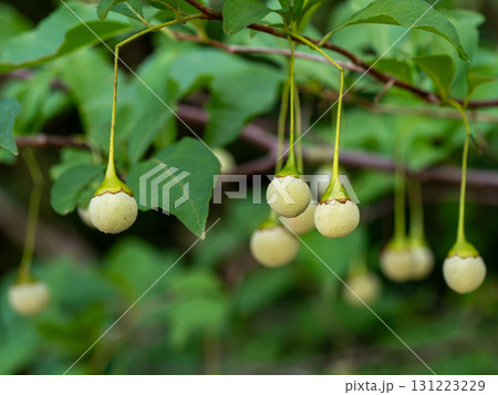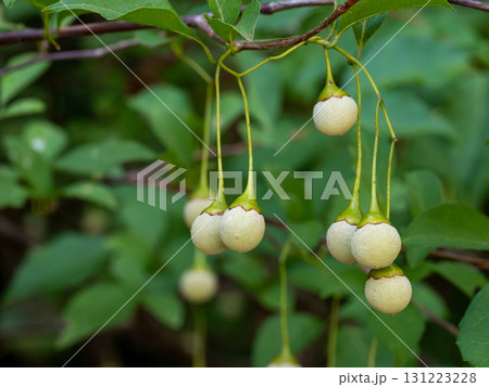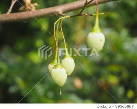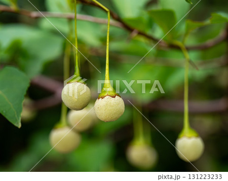 初夏に枝から垂れるエゴノキの実
