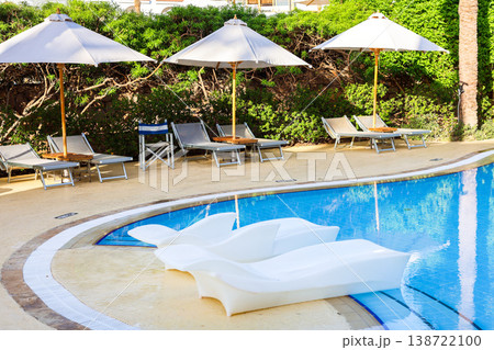 Two white comfortable sun loungers by the pool