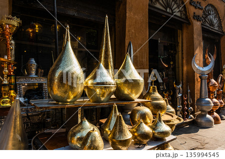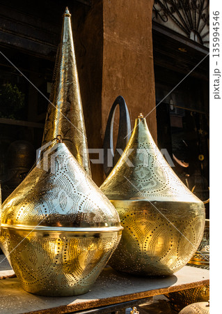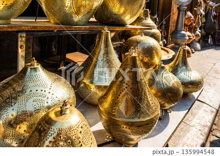 Ornate brass table lamps displayed in a market. Various shapes and sizes, reflecting traditional Egyptian craftsmanship. Ideal for Ramadan decor.