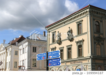 エストニア第二の都市タルトゥのラエコヤ広場入口(手前の彫刻がある建物は法律事務所)