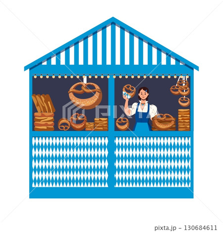 Traditional German pretzel stand with woman vendor in dirndl serving fresh baked goods at festive blue striped booth with hanging lights and Bavarian pattern