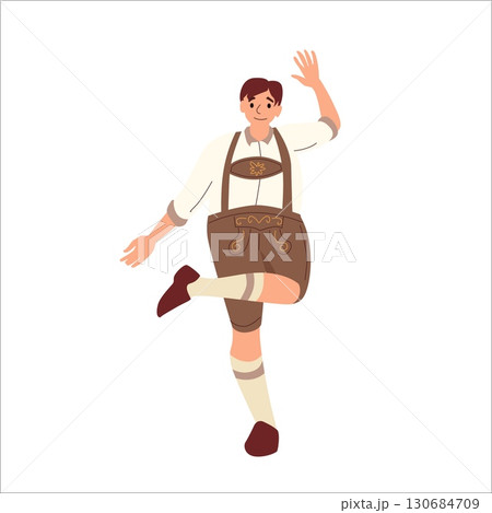 Man in traditional Bavarian costume performing folk dance with raised arm and crossed leg celebrating Oktoberfest cultural festival