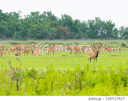 【北海道】牧草畑のエゾシカの群れ