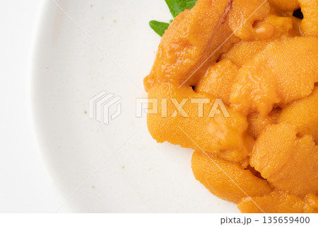 白背景にお皿に盛りつけた美味しそうな生のエゾバフンウニ