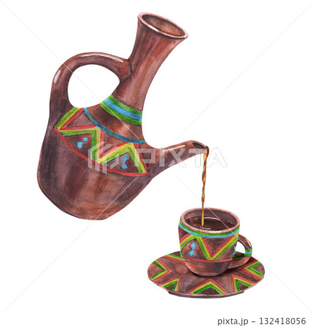 Traditional Ethiopian coffee brown pot and cup with geometric ornament made for ceremony. Watercolor isolated illustration set. For design, cafe, restaurant menu, posters, banners, recipes, clip art.