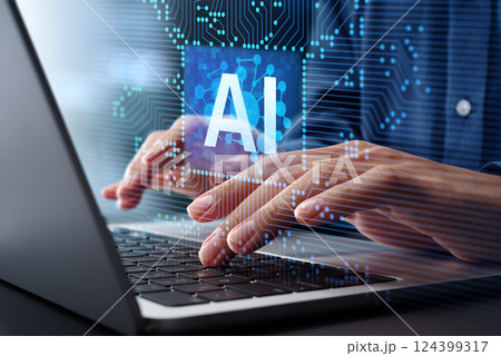 エッジAIと人工知能半導体。AIアイコンと電子回路。ノートパソコンを使う男性。