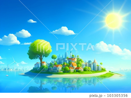 自然あふれるサステナブルな街並みと海と太陽(AI画像)