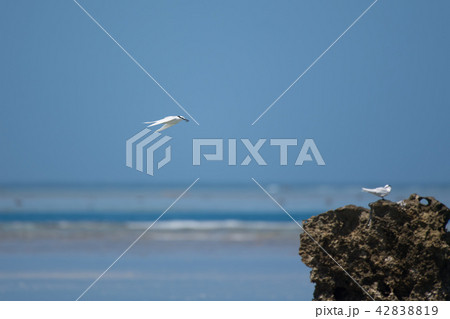 自然 鳥類 エリグロアジサシ、潮が満ち始めた岩礁で羽を休める