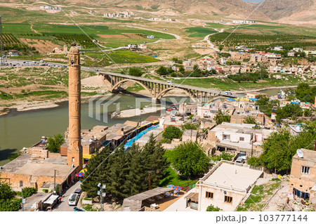 トルコ ハサンケイフのエル・ルズク・ジャーミーとティグリス川に架かるハサンケイフ橋