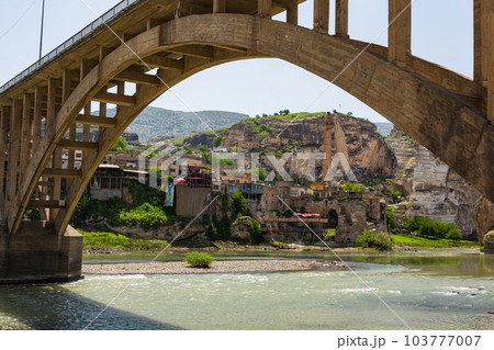 トルコ 水没前のハサンケイフの街並みとティグリス川に架かるハサンケイフ橋