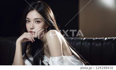 ベッドに座る下着姿の美女