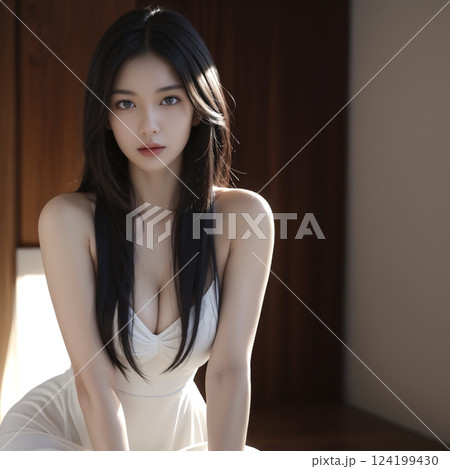 白いドレスを着た長い黒髪の若いアジア人