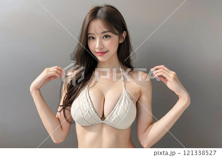 豊満な美しいバストを持つ若いモデル女性が下着を身に着けている