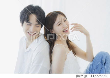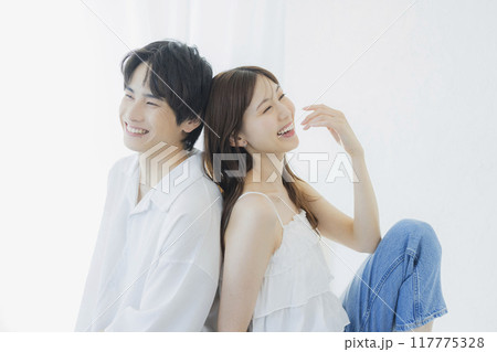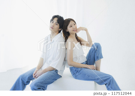 ウエディングドレスとタキシードの新郎新婦フォトウエディング白バック背景