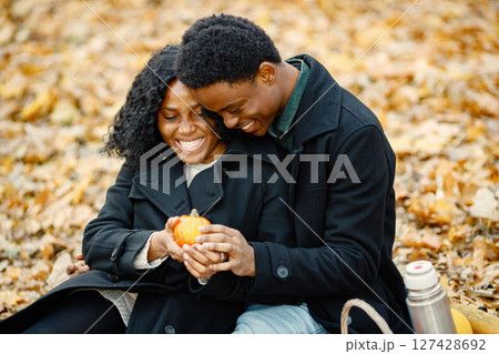 Black man and woman looking on little pumpkin. Romantic couple sitting on a blanket in autumn park. Man and woman wearing black coats.