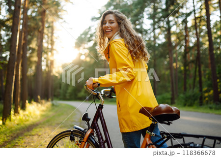 Happy woman with curly hair rides bicycle in sunny autumn park. Outdoor. Lifestyle. Nature concept.