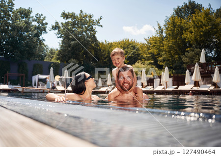 Boy is sitting on man shoulders. Happy family of father, mother and son are in the pool