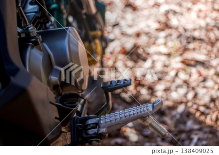 バイクのエンジンとステップ、メカニカルなディテール、彩度高め