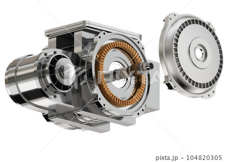 白バックに電気自動車用モーターとギアボックスのイメージ