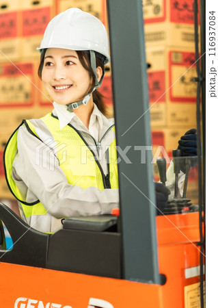 フォークリフトを運転する20代女性作業員