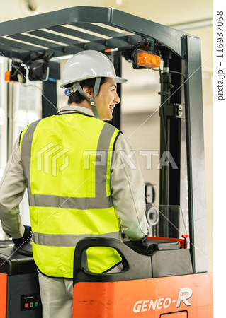 フォークリフトを運転する笑顔の30代男性作業員