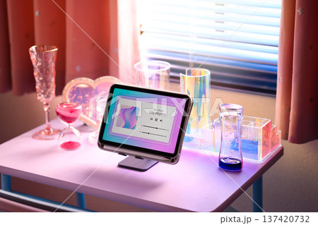 机上のタブレットと小物