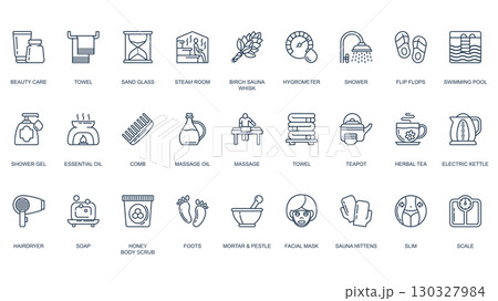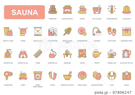 Sauna icons set in outline stroke design for web. Pack line pictograms with beauty care, towel, sandglass, steam room, birch whisk, shower, flip flops, gel, essential oil, more. Vector illustration.
