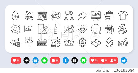 Heart, Market location and Survey results line icons pack. Social media: share, comment, like icons. Smile chat, T-shirt, Mattress web icon. Business vision, Bribe, People voting pictogram. Vector