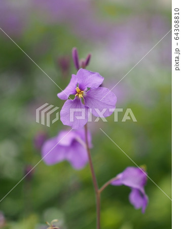 日本の春の庭に咲くムラサキハナナ(オオアラセイトウ)の紫色の花