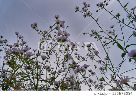 秋の空を見上げるシオンの花 観覧車を背景にした都会の野花
