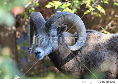立っているビッグホーンシープ(オオツノヒツジ)の雄のポートレート。カナディアンロッキー、ジャスパー国