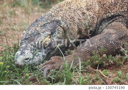 Large Komodo dragon (Varanus Komodoensis) resting on the ground in Komodo National Park, Rinca Island, Indonesia, showcasing its scaly skin and powerful claws