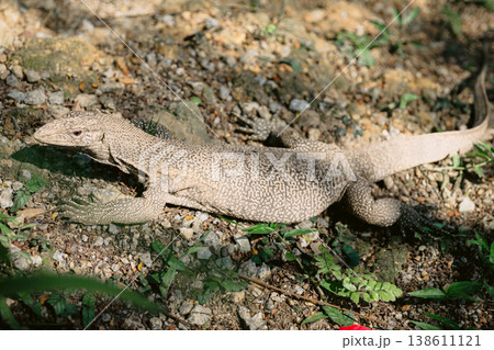 Large monitor lizard walks along tropical river in Phuket Thailand.