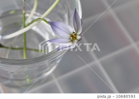 透明なグラスに生けたオオニワゼキショウ Annual Blue Eyed Grass and glass (Scientific name: sisyrinchium graminoides)