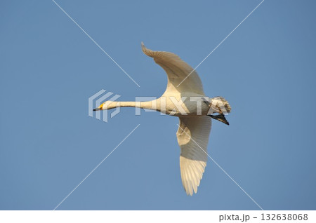 北海道の知床の野付半島の青空を飛ぶオオハクチョウ