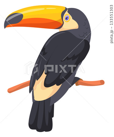 Tropical black toucan bird on the branch, cartoon exotic wild bird with orange beak, jungle fauna animal vector isolated