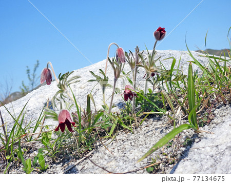 岩間に群生する暗赤紫色のオキナグサと青空