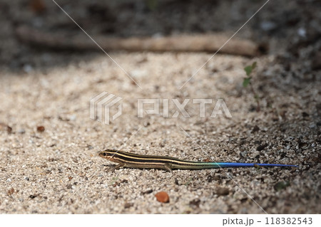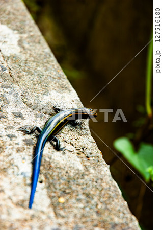 生き物 爬虫類 オキナワトカゲ、幼体です。体には金色にも見える条線が五本、尾は美しいブルーです