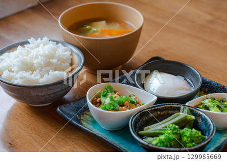 ご飯と味噌汁に納豆や温泉卵、野菜の小鉢を添えた和風朝食セット