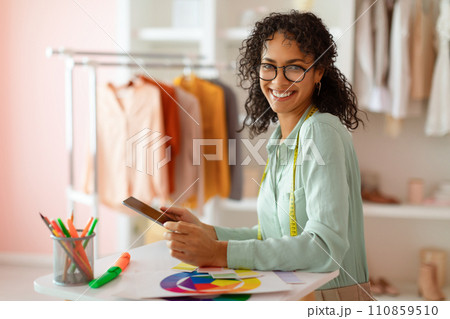 Confident ethnic young businesswoman typing on tablet sitting on terrace